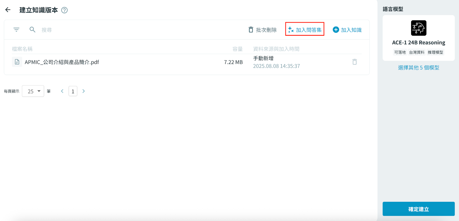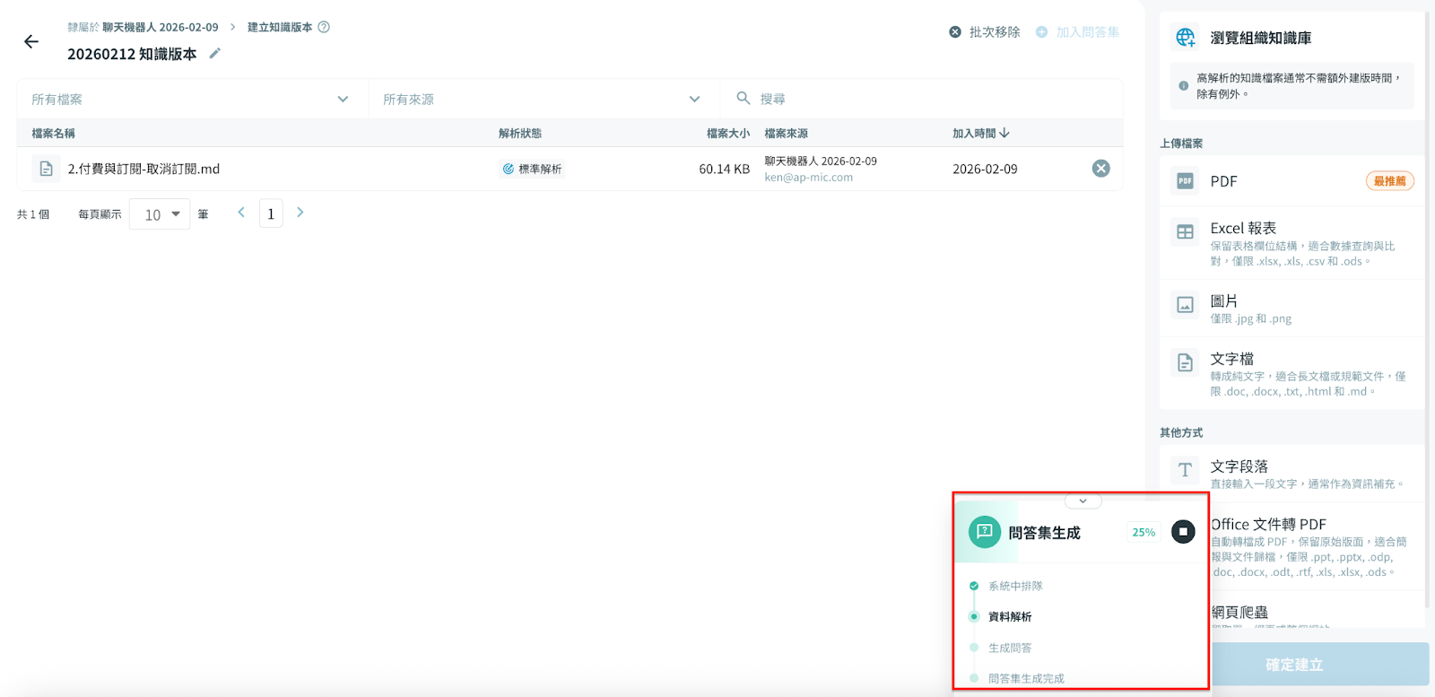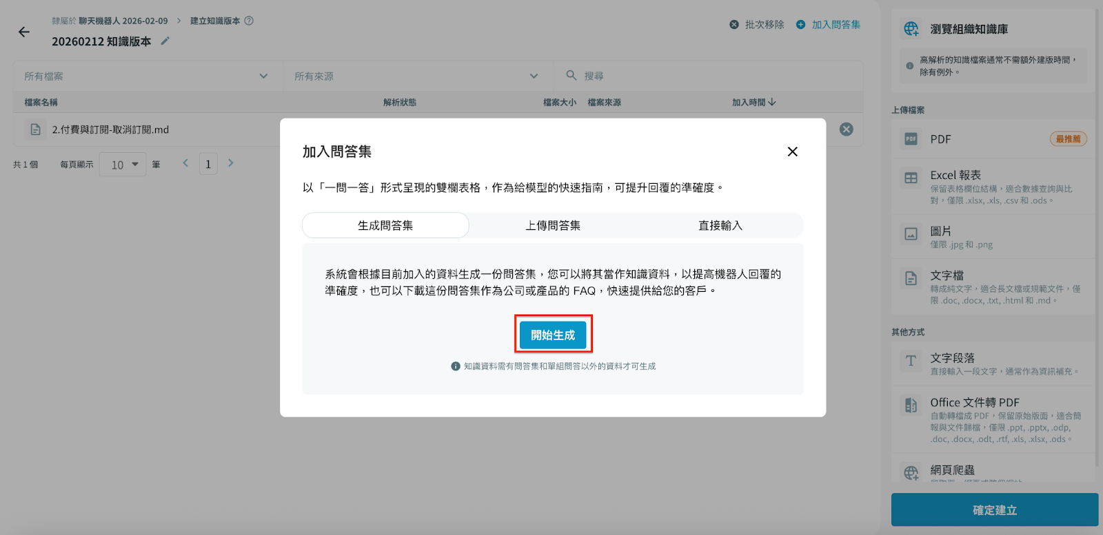系統會依據您已加入的知識資料,自動生成一份問答集,生成過程會顯示進度與結果。
