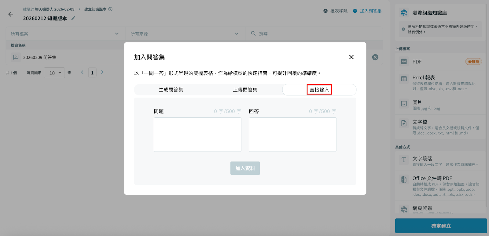 若您僅需新增少量問答,可直接於加入問答集頁面中點選「直接輸入」來輸入問答題組。