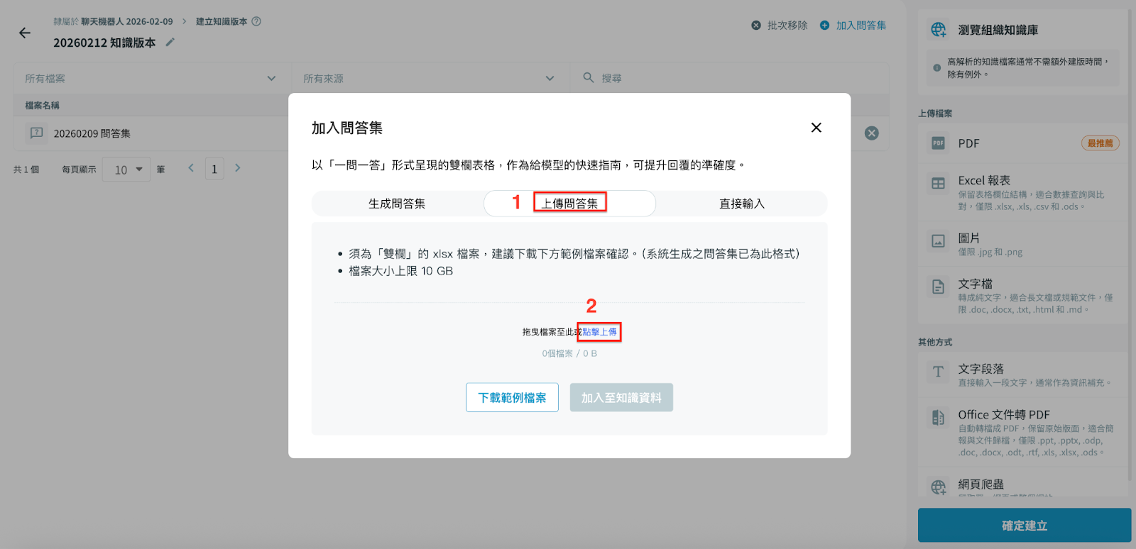 檔案需為 雙欄格式的 xlsx 檔(左欄為問題,右欄為答案)。建議先下載系統提供的範例檔,確認格式正確。