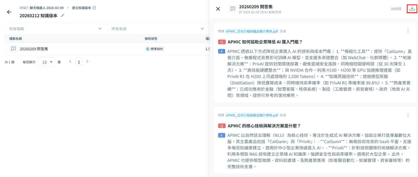 在「建立知識版本」頁面選擇欲下載的問答集 → 點擊 下載 按鈕,即可將檔案保存至您的裝置。