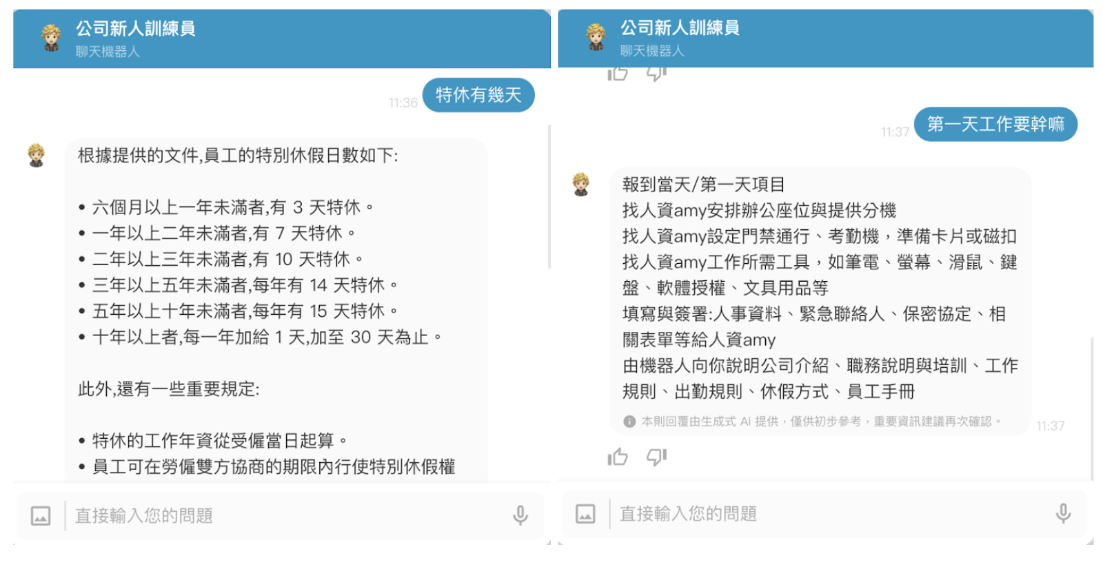 - 自動化培訓流程,減少人力成本,快速回答新人問題,確保知識傳遞順暢,幫助新員工迅速上手、輕鬆了解公司各項規定。