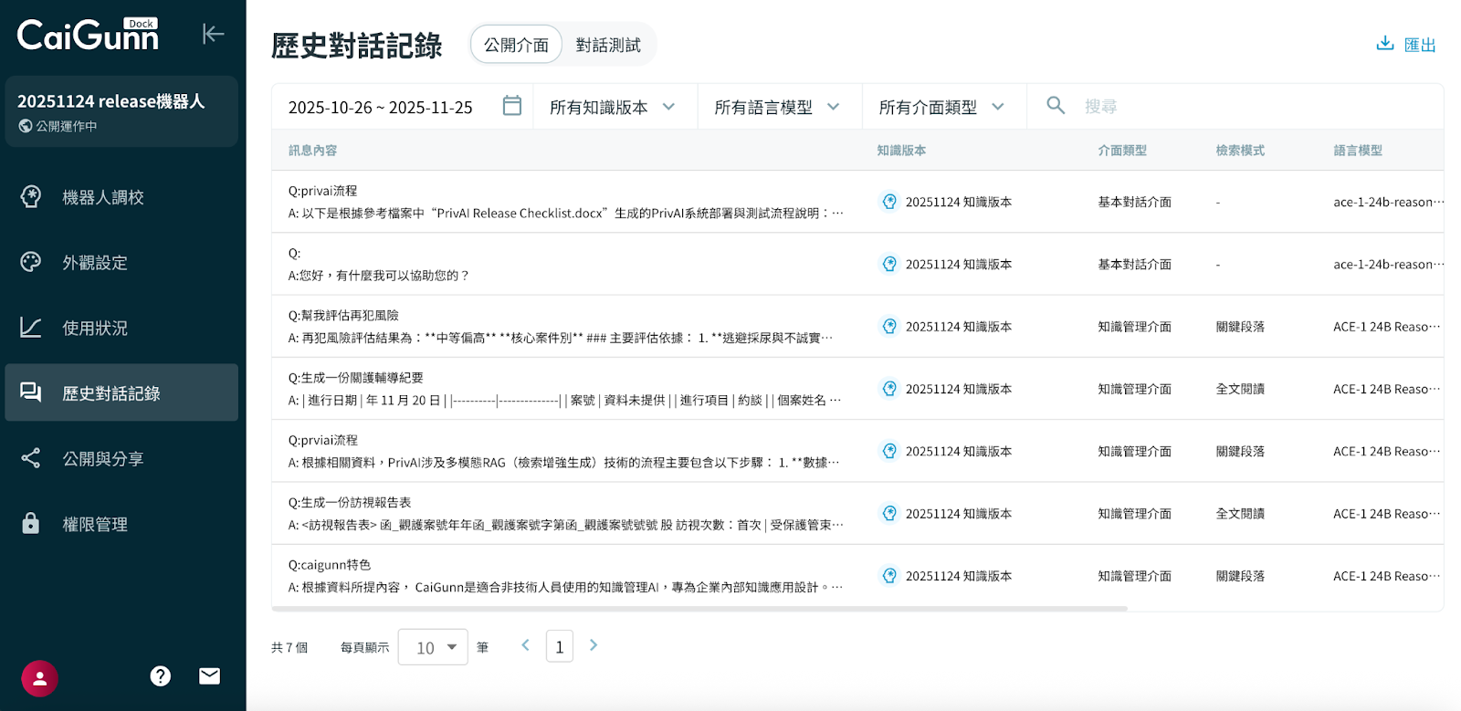 篩選特定知識版本及模型的對話紀錄