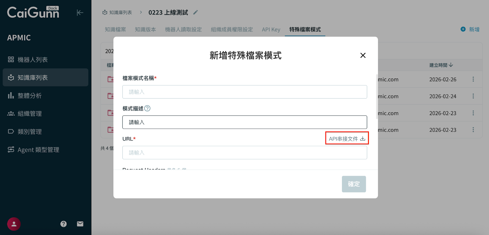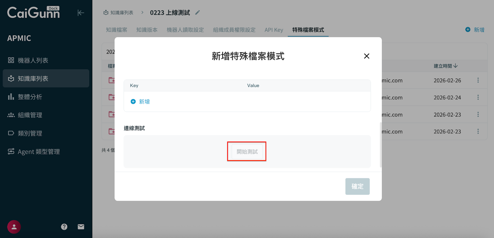 點擊「新增」即可開始新增您的特殊檔案模式,您可在此Dialog內點擊「連線測試」來測試外部API 有沒有成功連線,點擊後會顯示外部 Parse API 回傳內容。