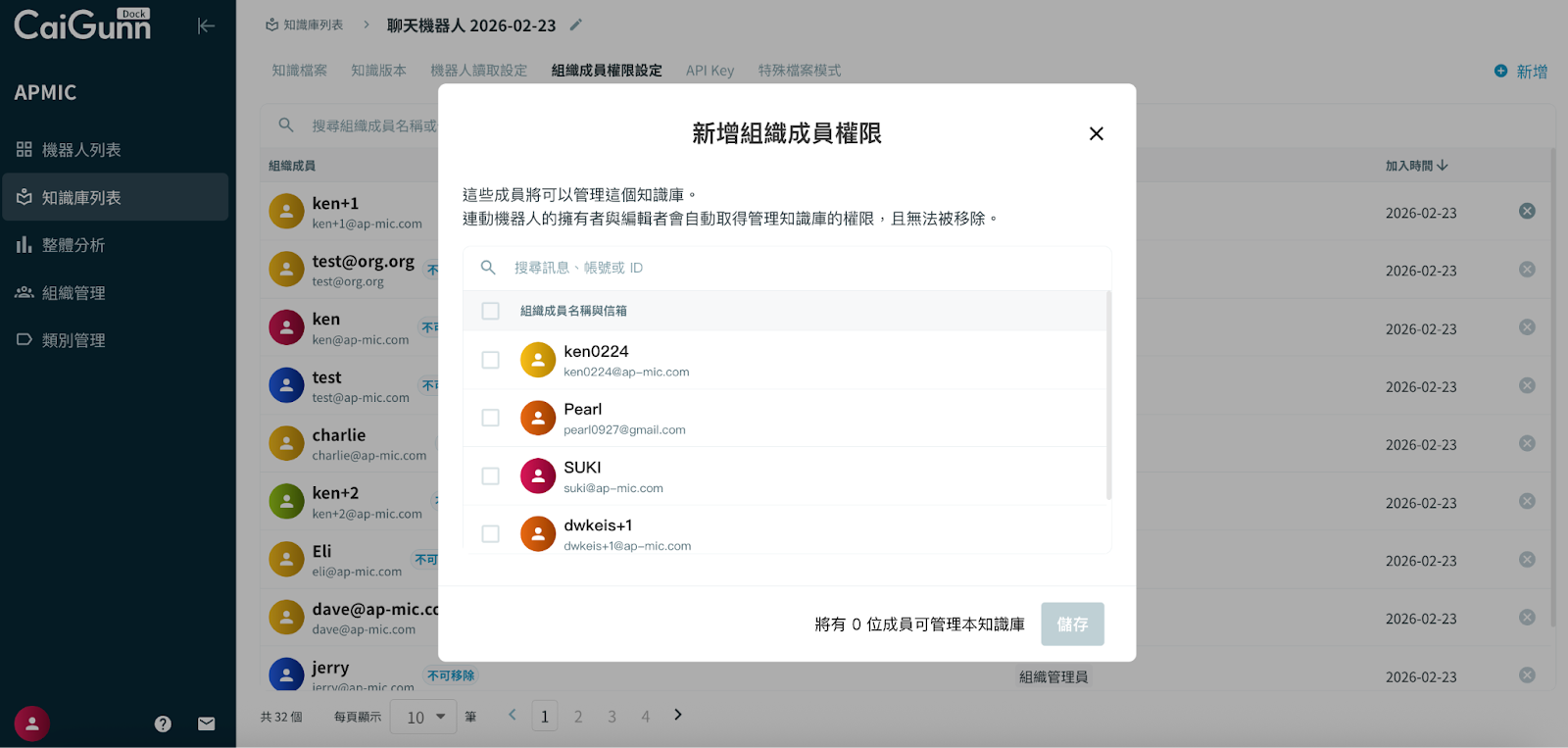 使用者可勾選一或多個成員來新增知識庫管理權限。