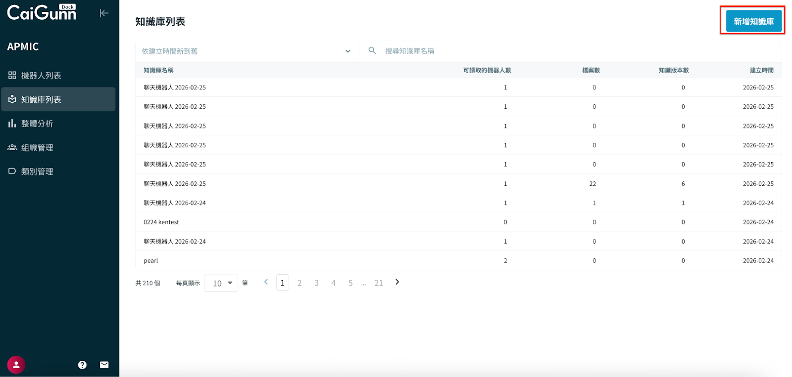 組織管理員可在知識庫列表中點擊「新增知識庫」來新增知識庫。