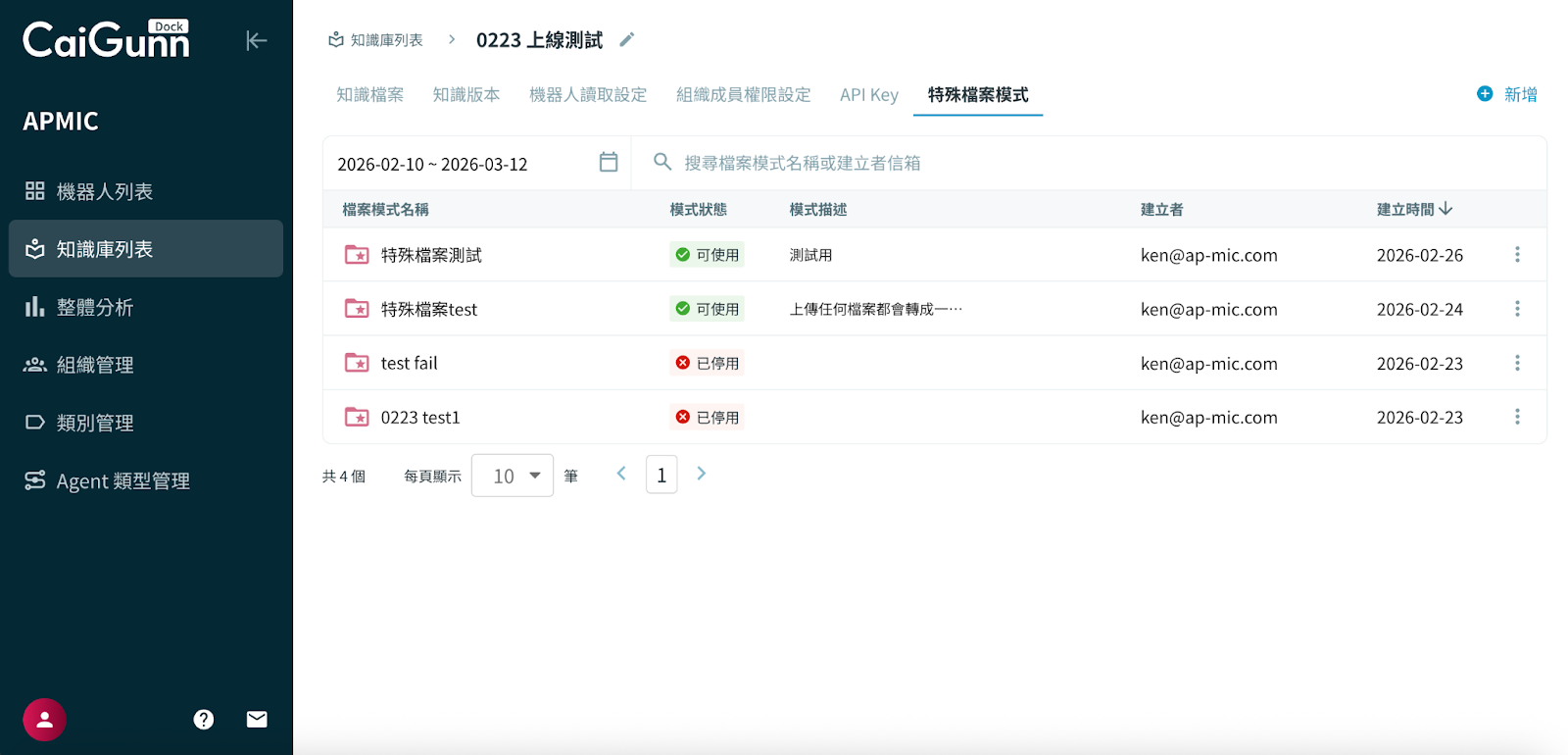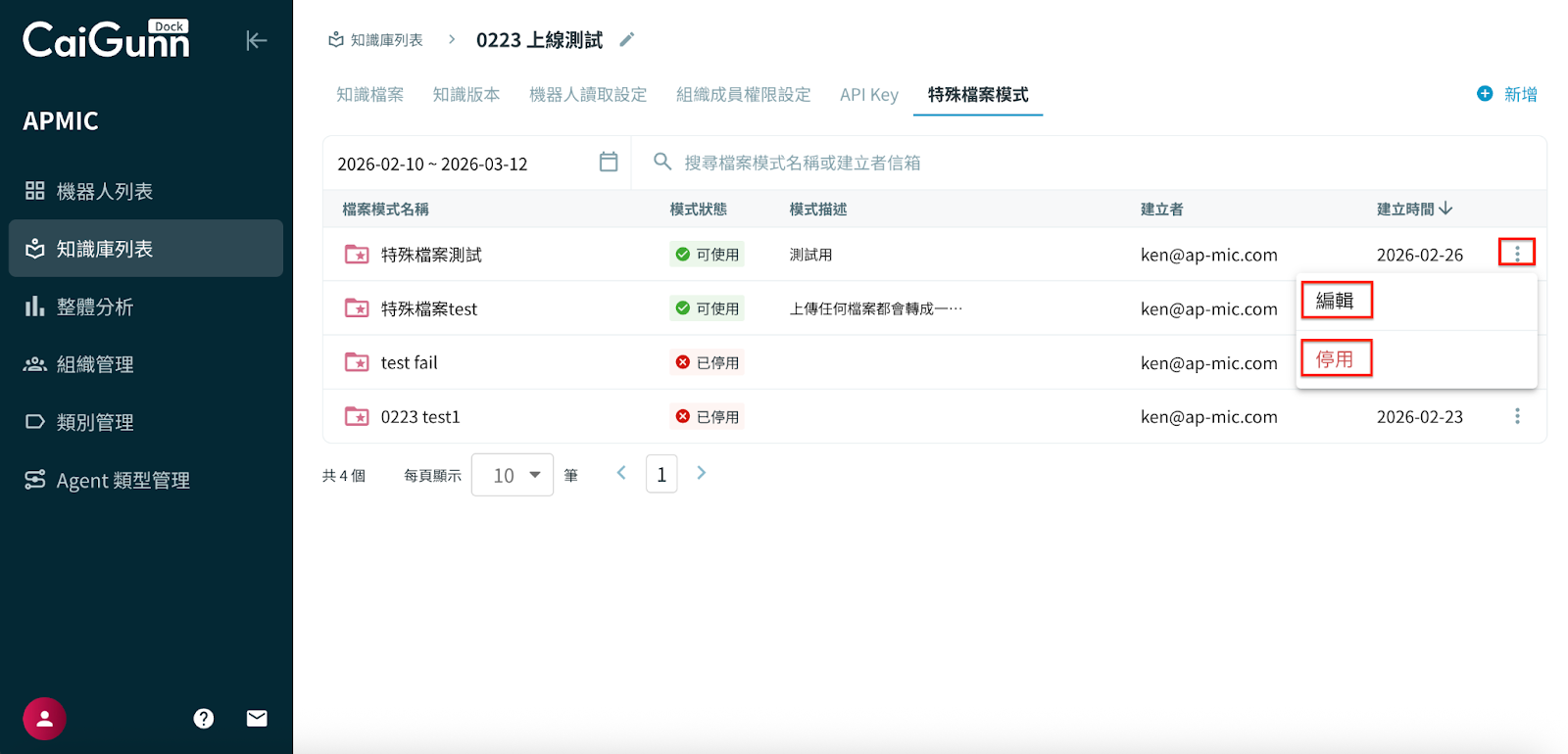 以「檔案模式名稱」或「建立者信箱」搜尋