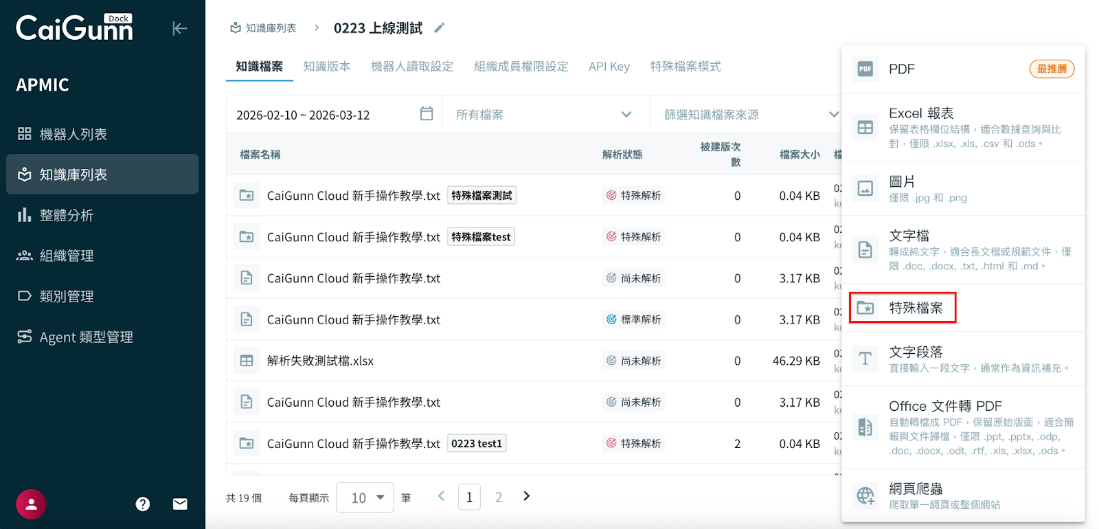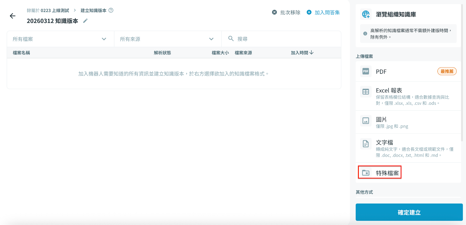 使用者可在知識庫中新增「特殊檔案模式」來上傳特殊檔案,並支援外部 Parse API 串接,上傳後可把檔案交由外部解析系統處理並回填結果,讓企業能導入垂直解析能力且保留可追蹤的成功/失敗狀態。
