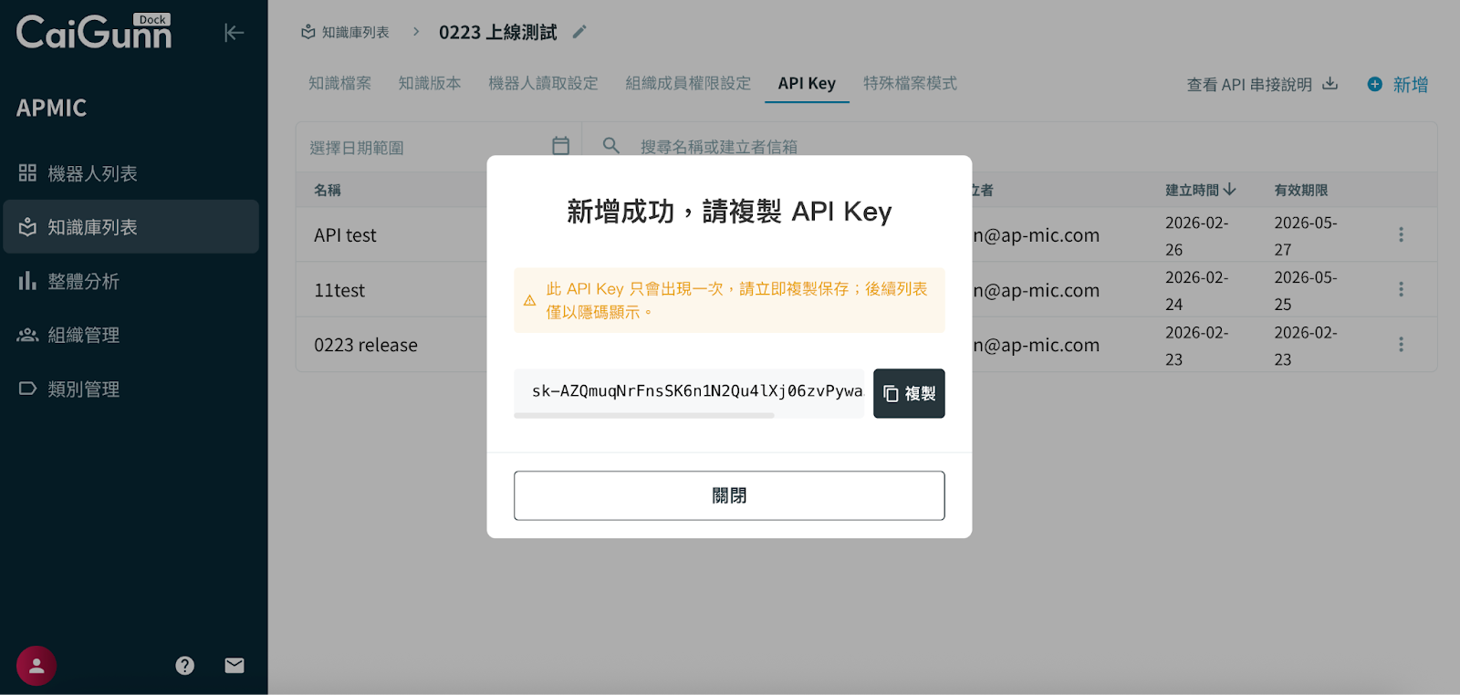 點擊新增即會跳出「新增 API Key」 Dialog,如新增成功會跳出「新增成功,請複製 API Key」,請注意此API Key 只會出現一次,請立即複製保存;後續於列表中僅會以隱碼顯示。