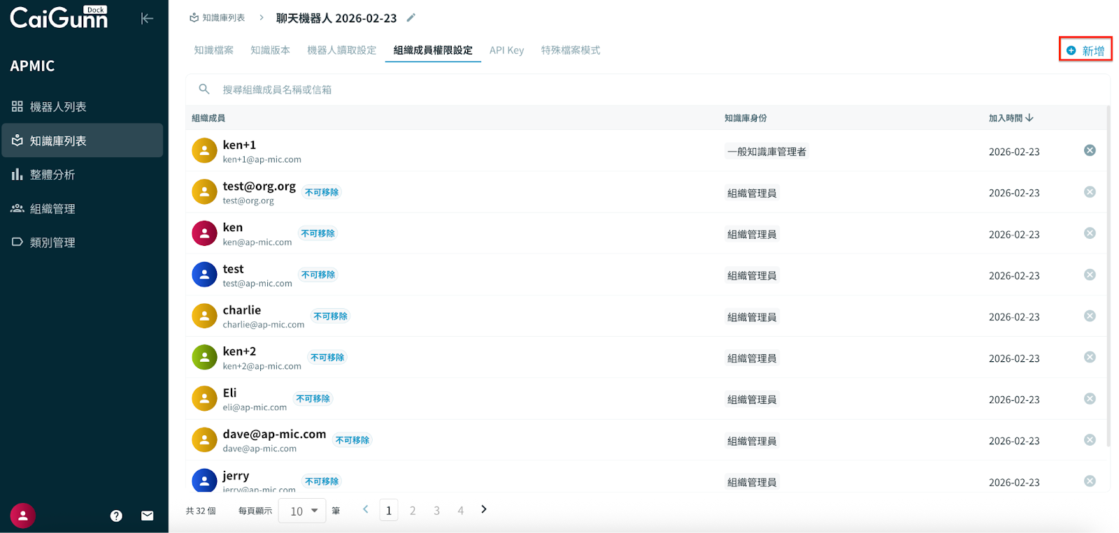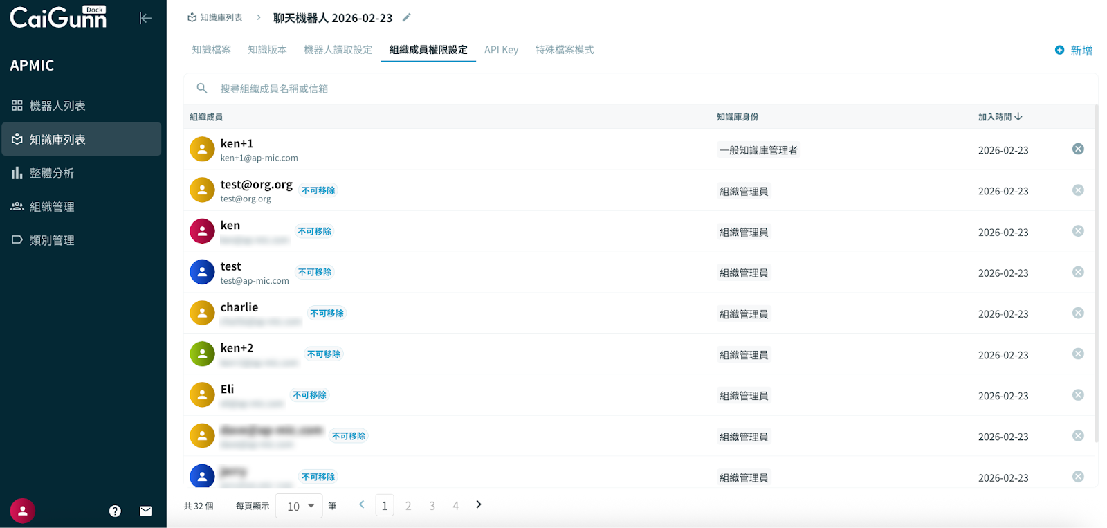 在組織成員權限設定分頁中會列出目前可管理該知識庫的所有知識管理員,且會顯示成員的知識庫身份及加入時間,並支援搜尋組織成員。