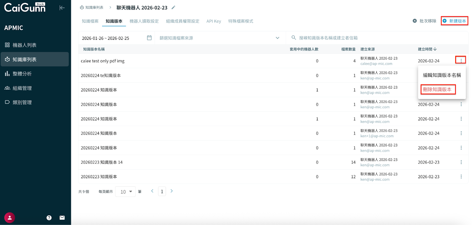 在此頁中組織管理員與知識庫管理員可新建知識版本,另外如知識版本未被「任何機器人使用」,則使用者可點擊「刪除知識版本」或批次移除來刪除知識版本。