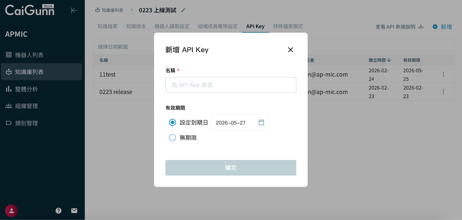 本系統提供 API Key 管理機制,使用者可建立、停用及追蹤 API Key 使用狀況,方便地端與 SI 客戶能安全進行系統整合。