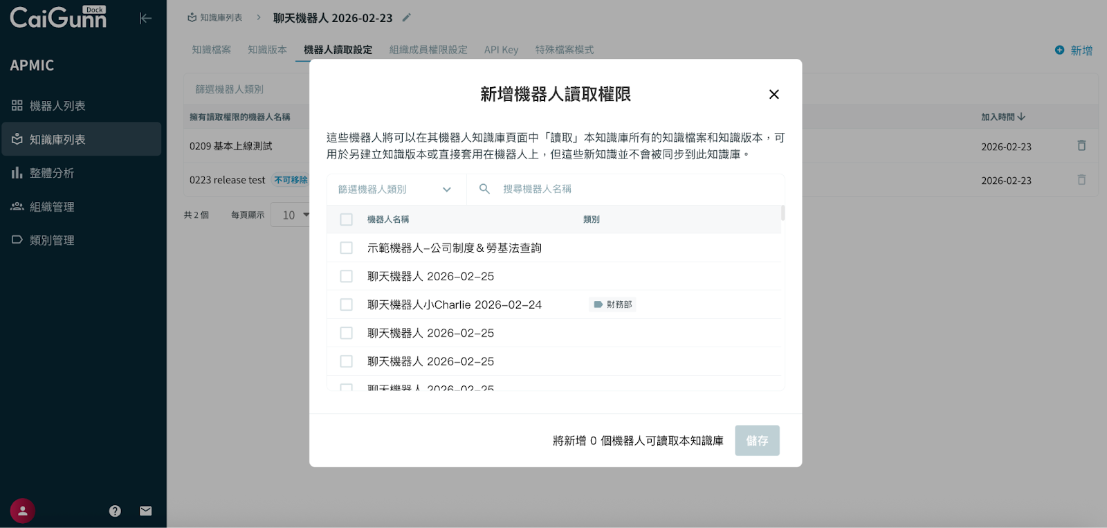 在機器人讀取設定分頁中會列出目前可讀取該知識庫的所有機器人。