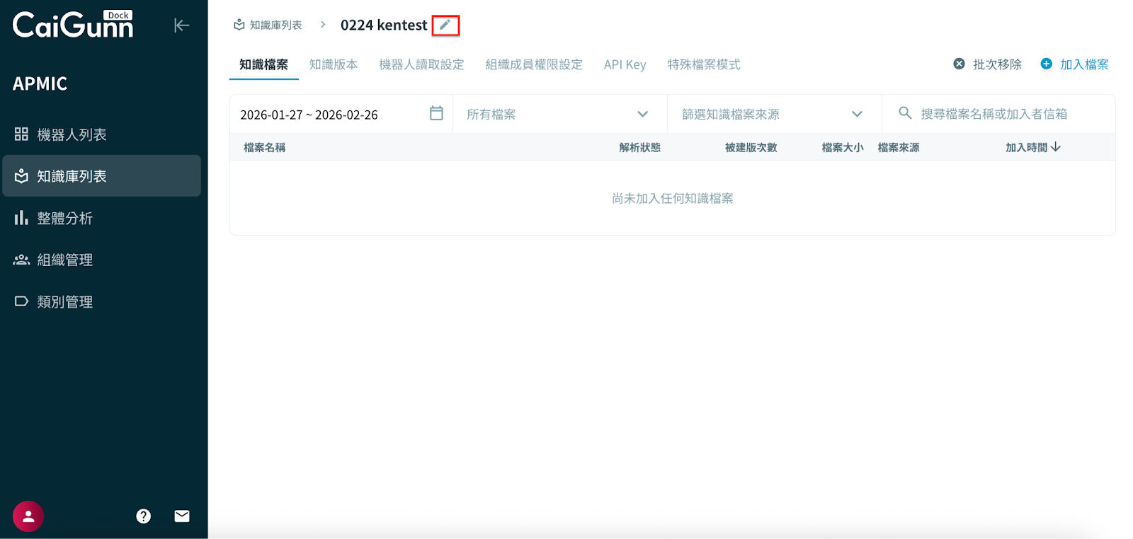 組織管理員與知識庫管理員可編輯知識庫名稱。