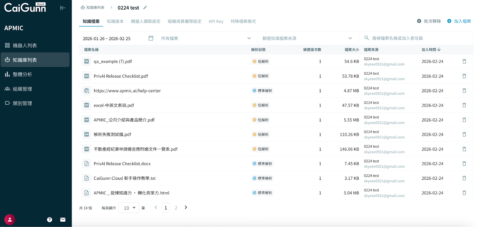 在此頁中組織管理員與知識庫管理員可加入新檔案,另外如檔案未被任何「正在被機器人使用」的知識版本引用,則使用者可點擊刪除圖示或批次移除來刪除知識檔案。