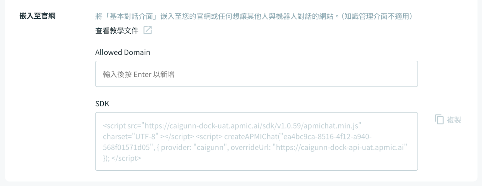 Allowed Domain 是用來指定哪些網站可以嵌入 CaiGunn Dock 的基本對話介面。您需要在「公開與分享」頁面中輸入允許的網域,然後複製 SDK 腳本,將其嵌入到這些被允許的網站上,這樣使用者才能在這些網站上與機器人進行互動。